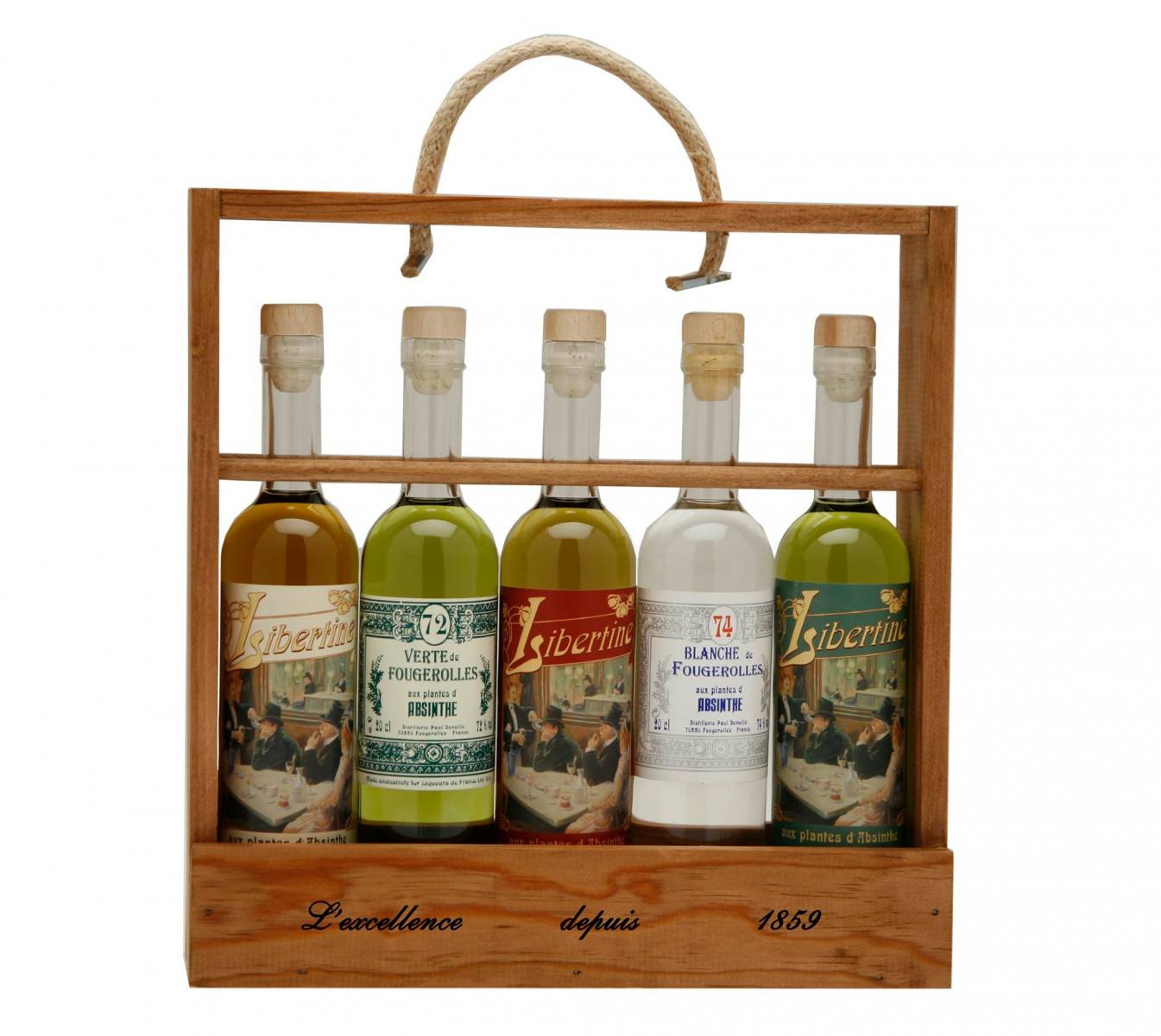 The result is a range of different characters of homemade Absinthes, whose Libertine label is directly taken from a painting, of course representing an Absinthe drinking scene in a bistro. An artwork, especially ordered from a young artist, from the Vosges. Moreover, their bottles can be sometimes accompanied with a sugar spoon, in their package!