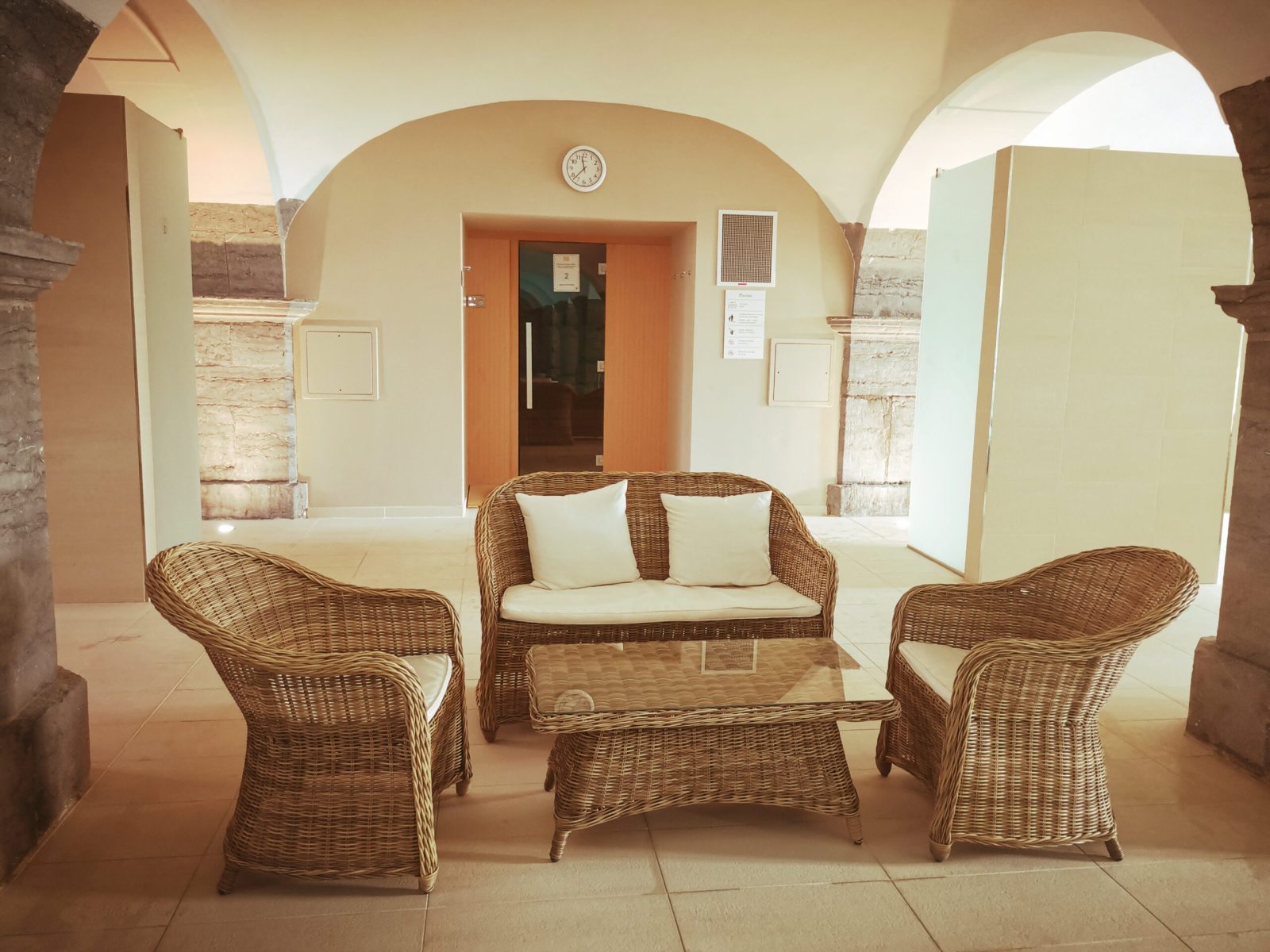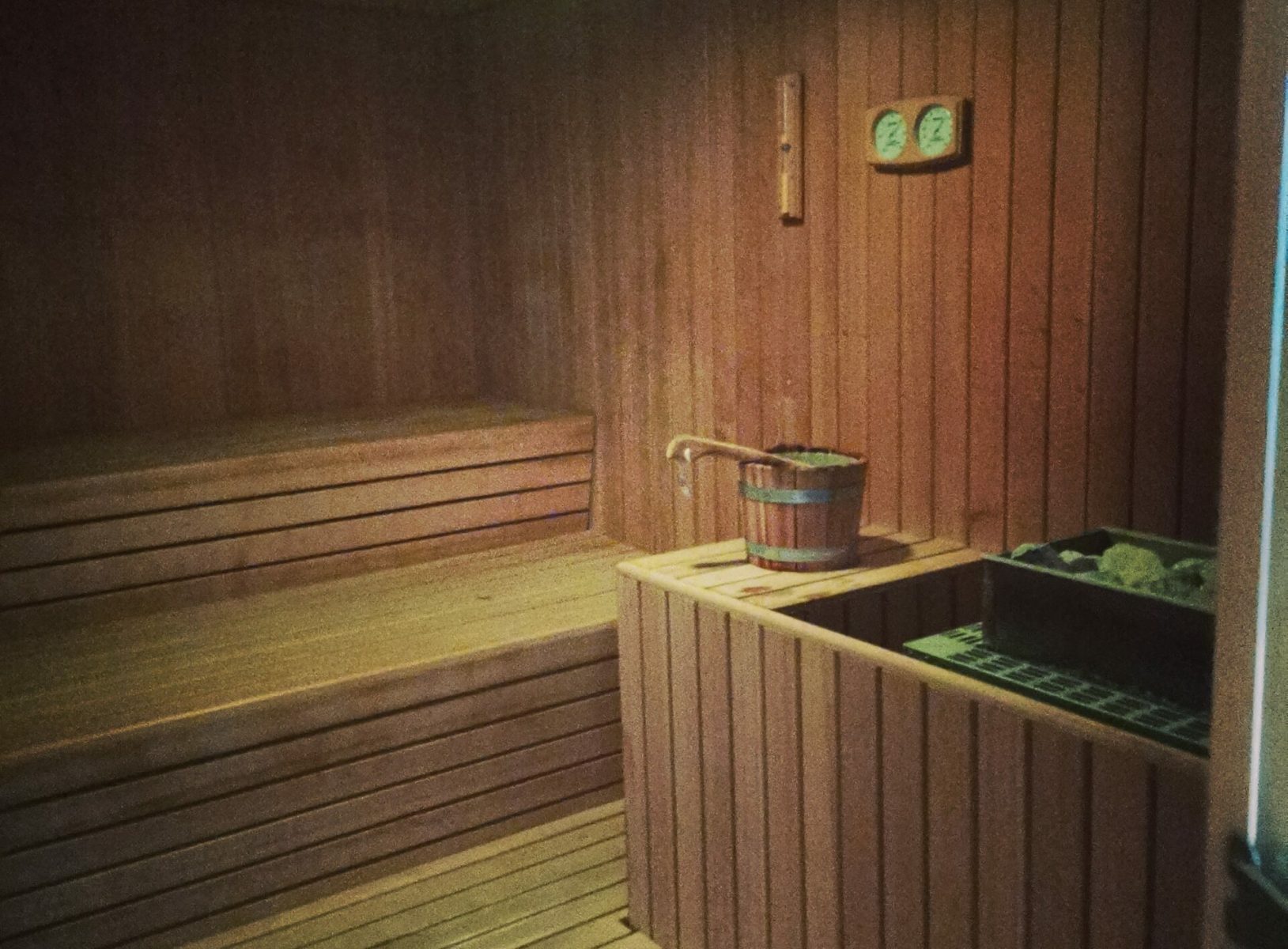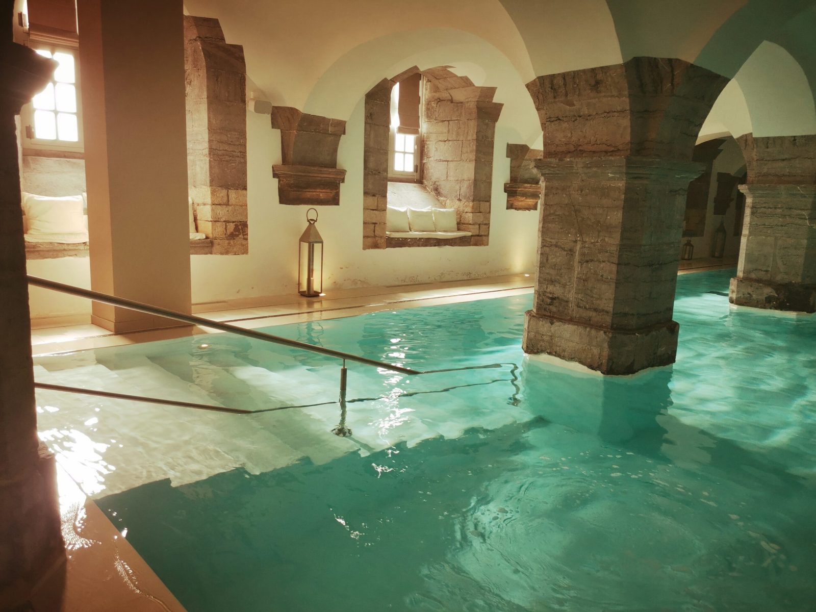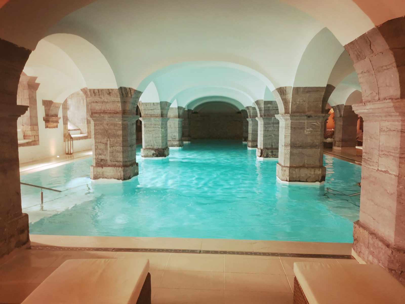 Once you reach this impressive and contemporary wellness area, you couldn’t miss then the amazing indoor swimming pool of 22 meters by 10. This blue horizon is surrounded and contrasted by the support of blue stone pillars, where you leave your wet hands marks. Thus, it’s an evidence that this honorable pool size allows many swimming and even relaxing possibilities beyond the various loungers around the basin.