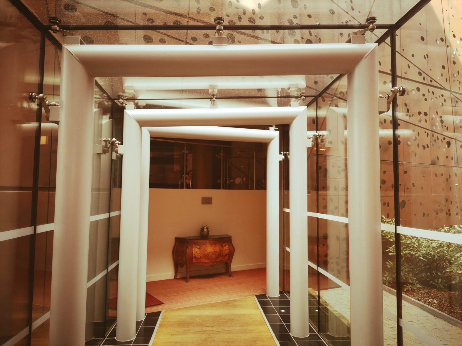 Therefore, just after passing an other historical part, including various adjoining fully equipped conference and meeting rooms, of different sizes, you can reach a pretty modern space. Thus, if you look for more well-being sensations, we invite you to join a modern SPA, located in a brand new building connected from this historical hotel, provided by a glassed walkway. In a space composed of noble materials, such as lacquered aluminum and calepinage, with full micro perforated sheets, for an original chromatic identity in its facade.