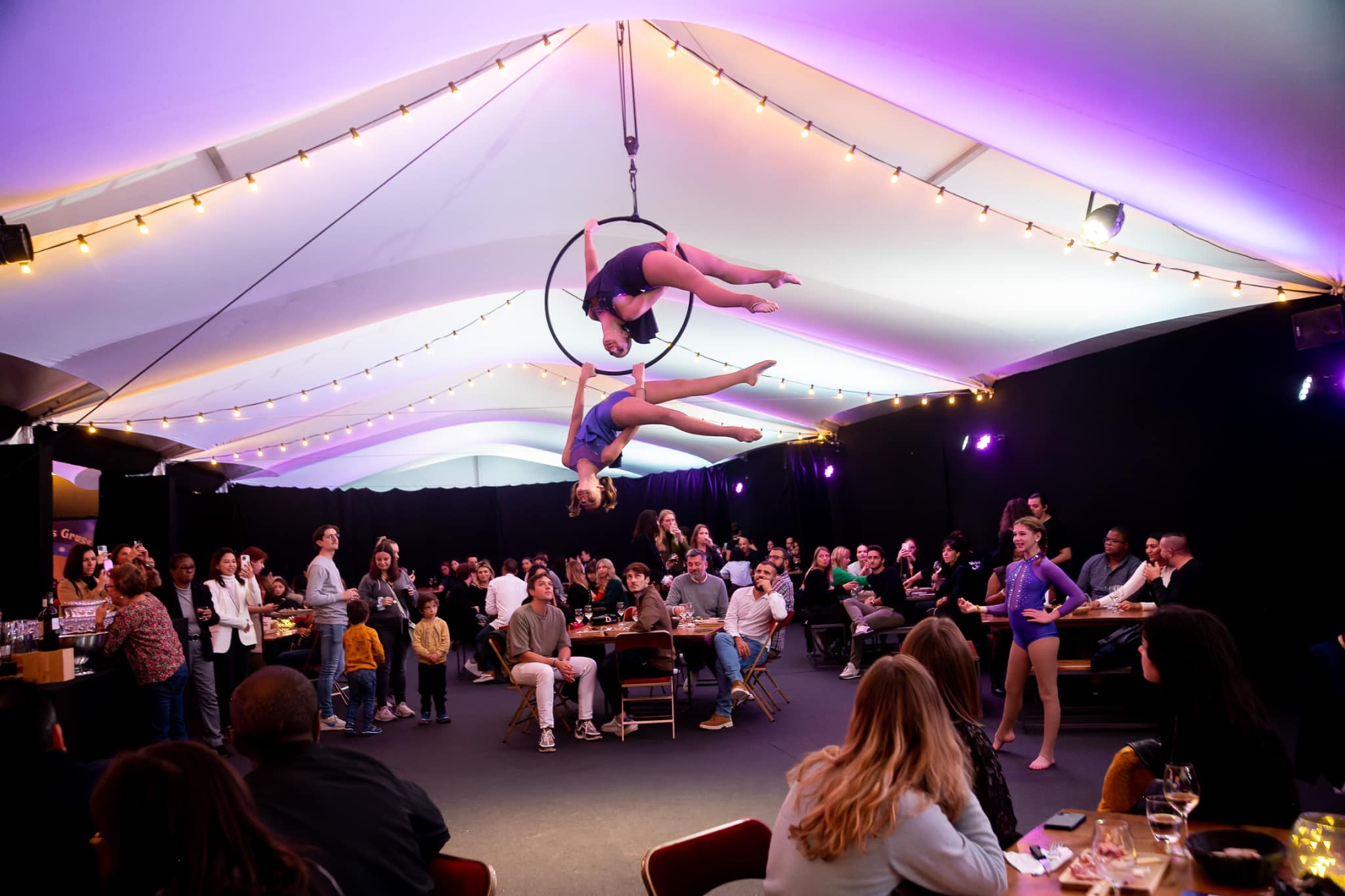 On top of that, enjoy a gourmet lunch in the midst of acrobats, horses and other amazing surprises (including a candyfloss and waffles bar), to share a good moment with your friends or even an artist, in a festive atmosphere. A real opportunity to live a unique convivial experience, where you can interact with your neighbors in the collective tables, even by watching a few circus acts, before and after the spectacle.