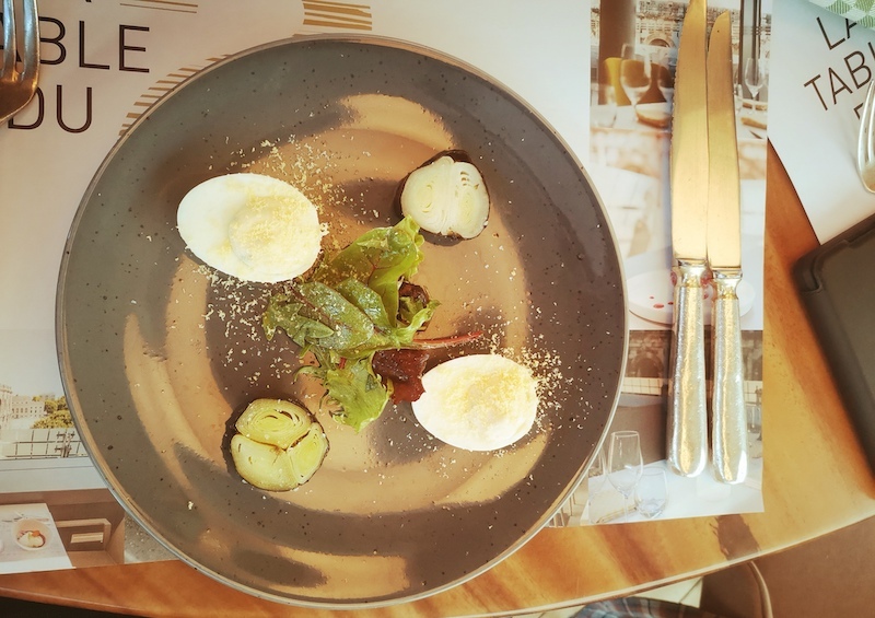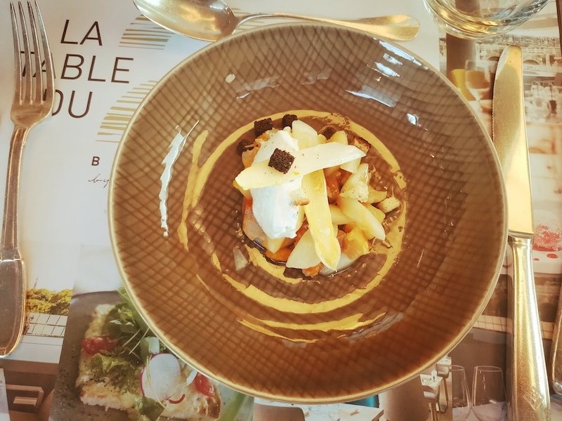 Followed by a fine sea bream and its green asparagus risotto or, if you prefer, stewed lamb accompanied by its spring vegetables. On a sweet note, you could have counted on a strawberry vacherin or a revisited and dismantled chocolate cookie.