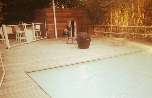 This lounge area stands nearby a bar counter, decorated by cloudy lights, leading to a large wooden terrace where waits for you a (non-heated) swimming pool (available from May until October), a tennis court or even a petanque zone.