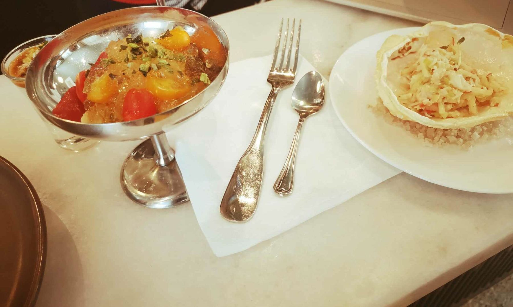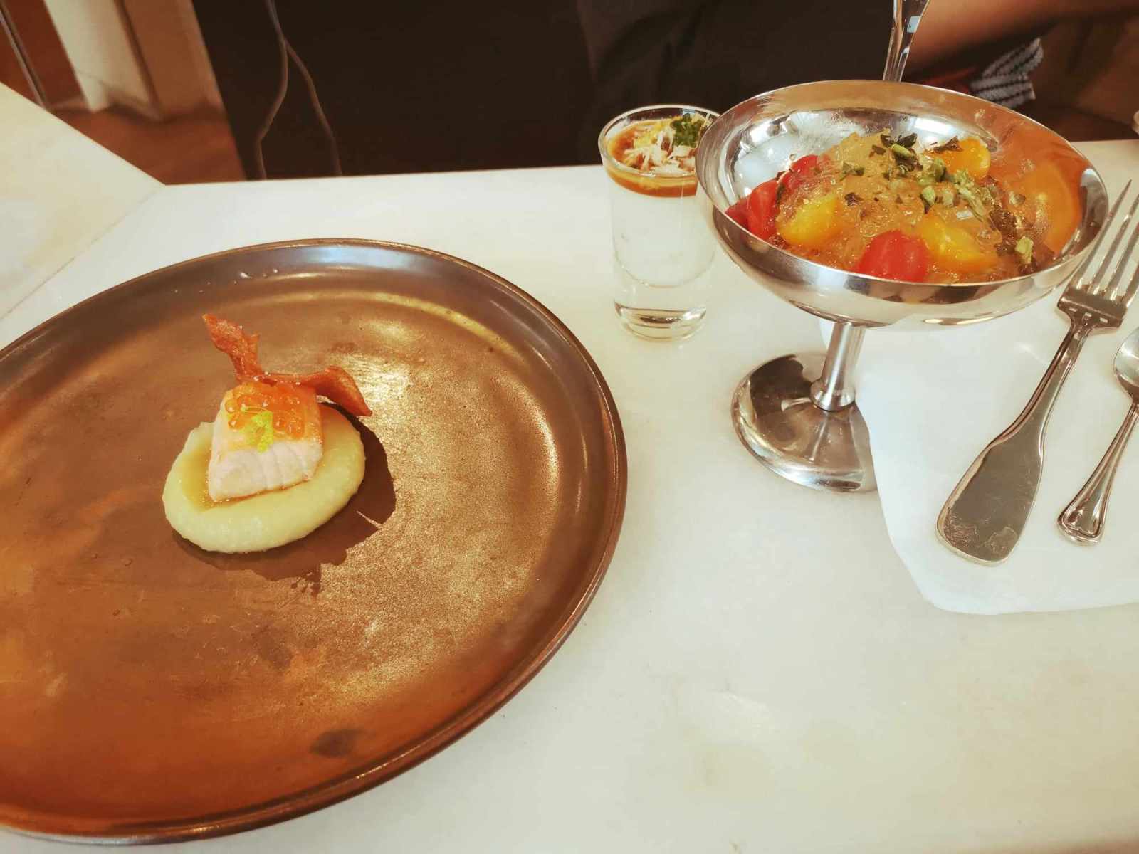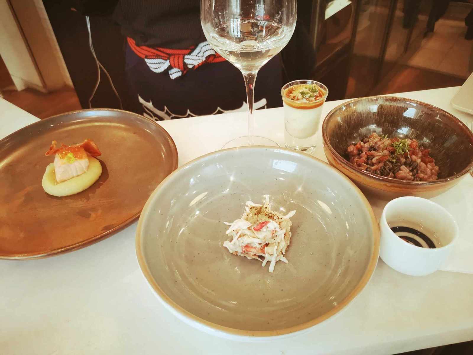This original appetizer was followed by some poached squid, covered by tomato datterini, plus ascetic garlic but also green zebra tomato‘s juice. Without forgetting a smooth salad of snow crab, mixed with apple and celery, under some Japanese mayonnaise and mustard sauce.