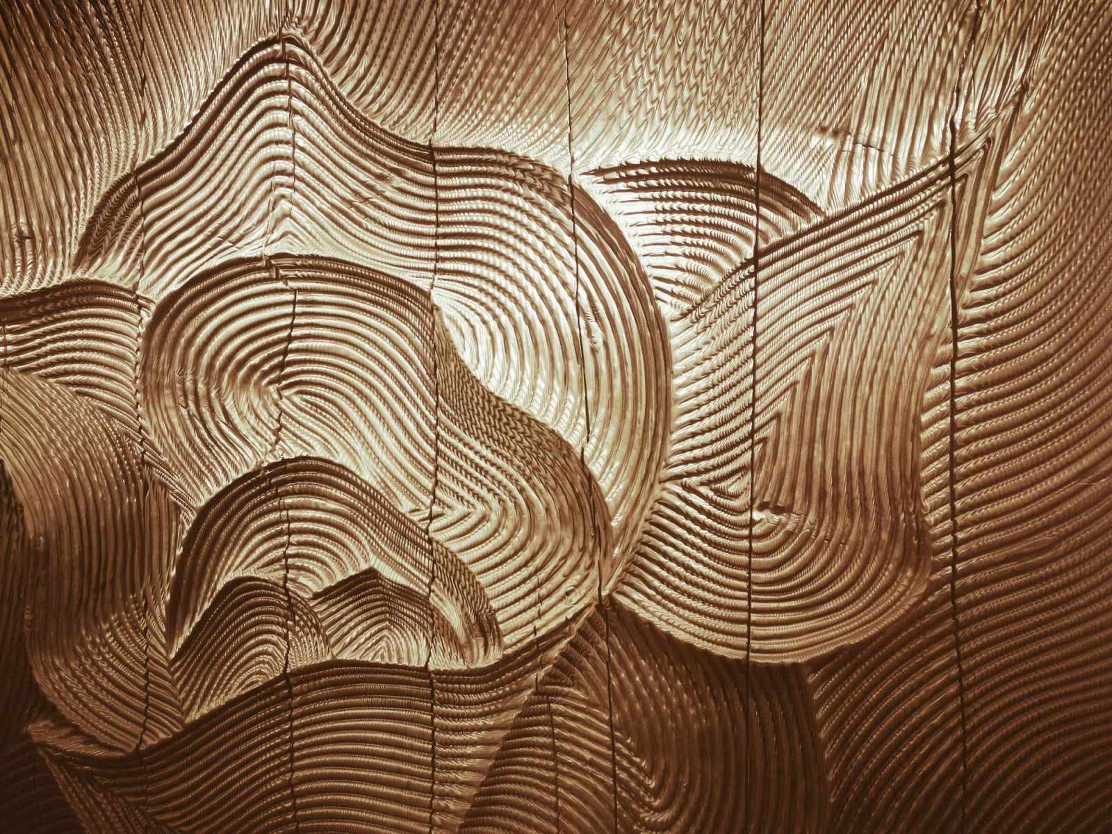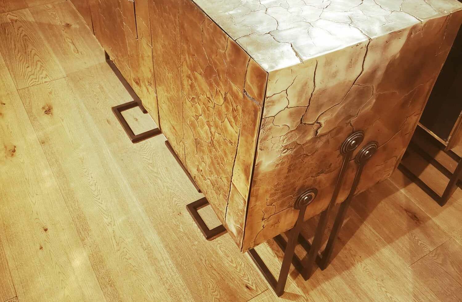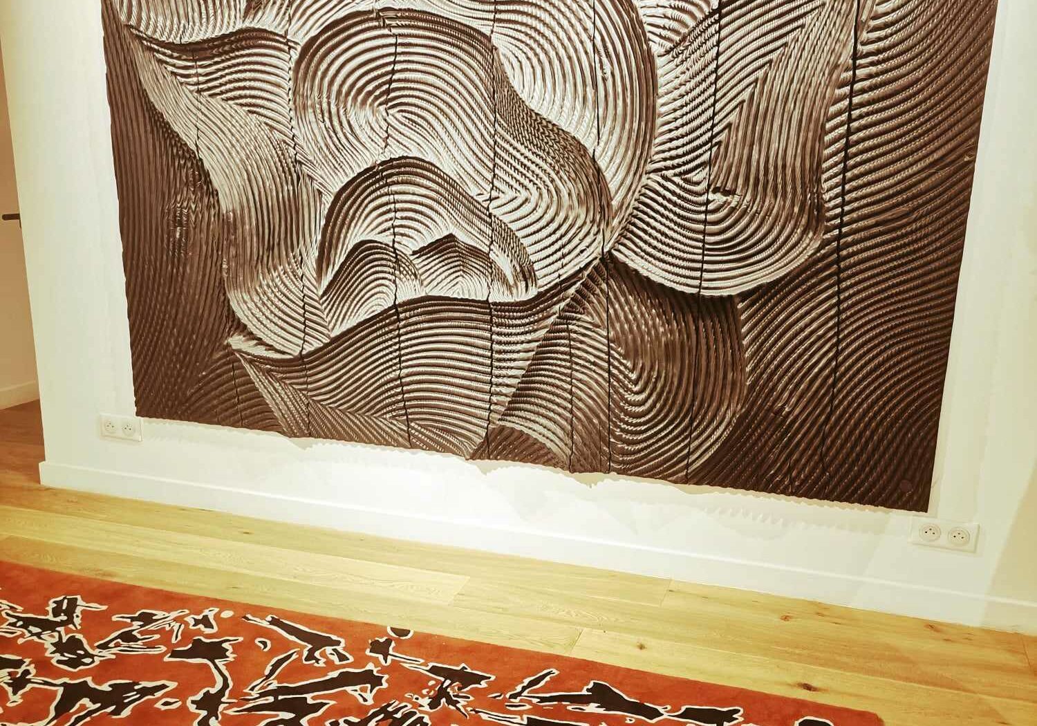 A style that pretty much puts an echo to the copper style of Erwan Boulloud, displayed through his different visions of flashy furniture and decoration. This movement can be also pursued in the saccadic rhythm conveyed by Daniel Humair’s paintings, but also Etienne Moyat’s sculptural waves emerging from his wooden panels and in Gianluca Pacchioni’s alloy of marble and metals, notably visible in his Collapse bookcase. As you can see, those artworks distillate a certain a visual dynamic that punctuates this unmissable exhibition.
