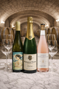 We start this Parisian introduction tour with the Brut 2020 cuvée, brought by Hermann J. Wiemer Vineyard illustrates precise expertise in the traditional method. A balanced Chardonnay/Pinot Noir blend, it charms with its freshness, taut minerality, and fine mousse, enhanced by 44 months on lees (photo credits: AI).